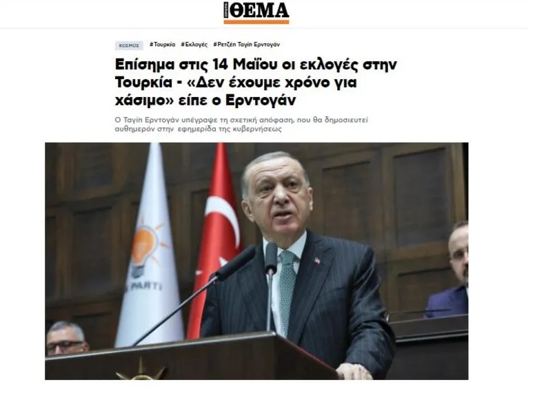 Protothema, Cumhurbaşkanı Erdoğan'ın 'Kaybedecek zamanımız yok' sözlerini manşetine taşırken seçim takviminin ayrıntılarını okuyucuları ile paylaştı.