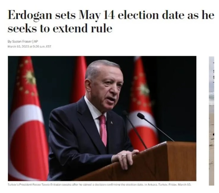 Amerikan Politico dergisi Erdoğan'ın resmi seçim tarihini belirlediğini duyurduğu haberinde seçimin planlanandan bir ay önce yapılacağını vurguladı ve Erdoğan'ın 14 Mayıs’ı, 6 Şubat'ta meydana gelen Kahramanmaraş merkezli depremlerdeki "yıkımın izlerini silecek hayırlı bir yarışa dönüştürmek" istediğini yazdı.