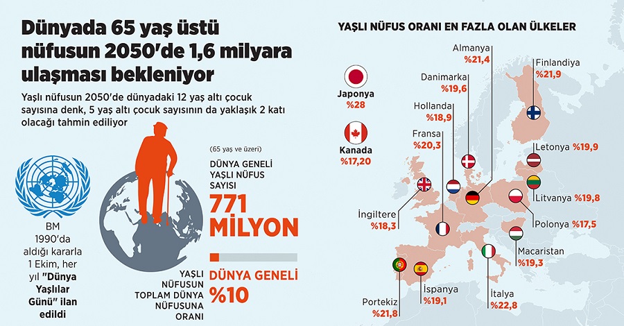 Dünya genelinde 65 yaş ve üstü 771 milyon kişi kayıtlara geçti. Bu yaşlı nüfusun 2030’da 994 milyon, 2050’de 1,6 milyara ulaşması bekleniyor.