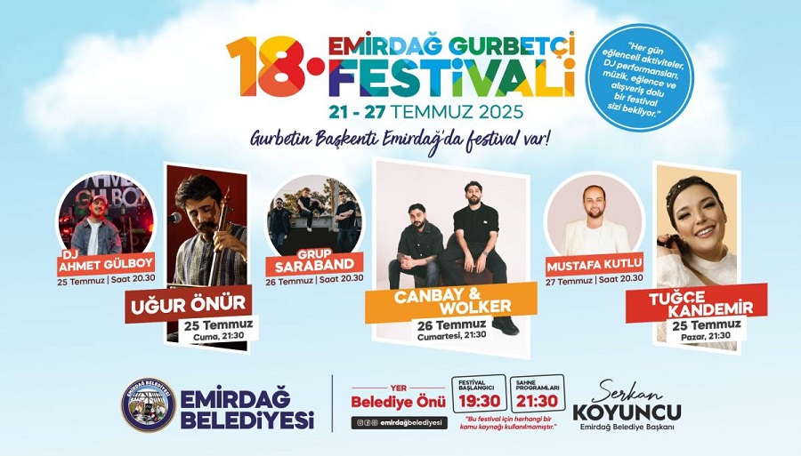 Afyonkarahisar’ın gurbetle özdeşleşen ilçesi Emirdağ, bu yıl da özlemle beklenen "Gurbetçi Festivali" ile sahneleri ve sokakları şenlendirmeye hazırlanıyor. “Gurbetin Başkenti Emirdağ’da festival var!” sloganıyla düzenlenecek olan 18. Gurbetçi Festivali, 21-27 Temmuz 2025 tarihleri arasında yurt içinden ve yurt dışından binlerce Emirdağlıyı bir araya getirecek.