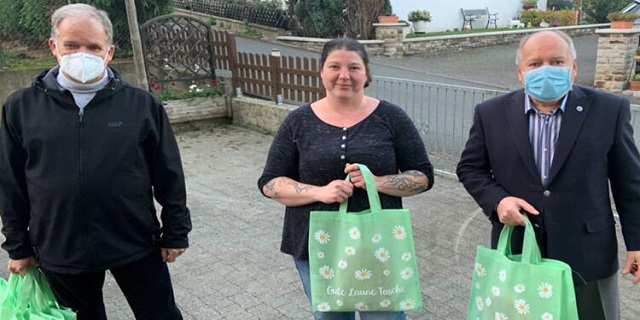 EhringshausenBelediye Başkanı Jürgen Mock (sağda) ve Mehmet Şaşmaz, Türkiye’ye özgü gıda ürünleri içeren hediye torbalarını Şaşmaz’ın komşularına birlikte dağıttılar.