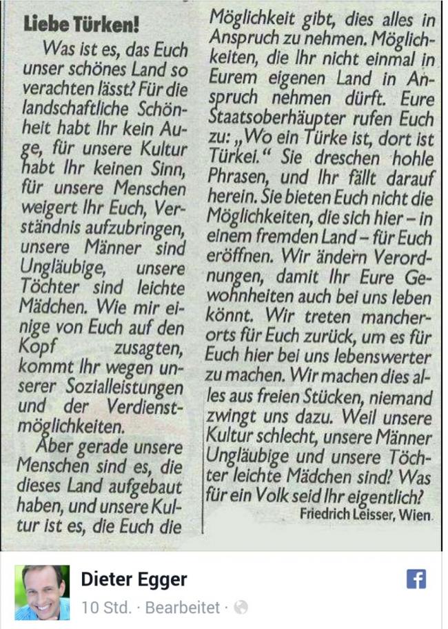 Dieter Egger, 2009 yılında Avusturya gazetesi Kronen Zeitung'da bir okuyucunun yazmış olduğu