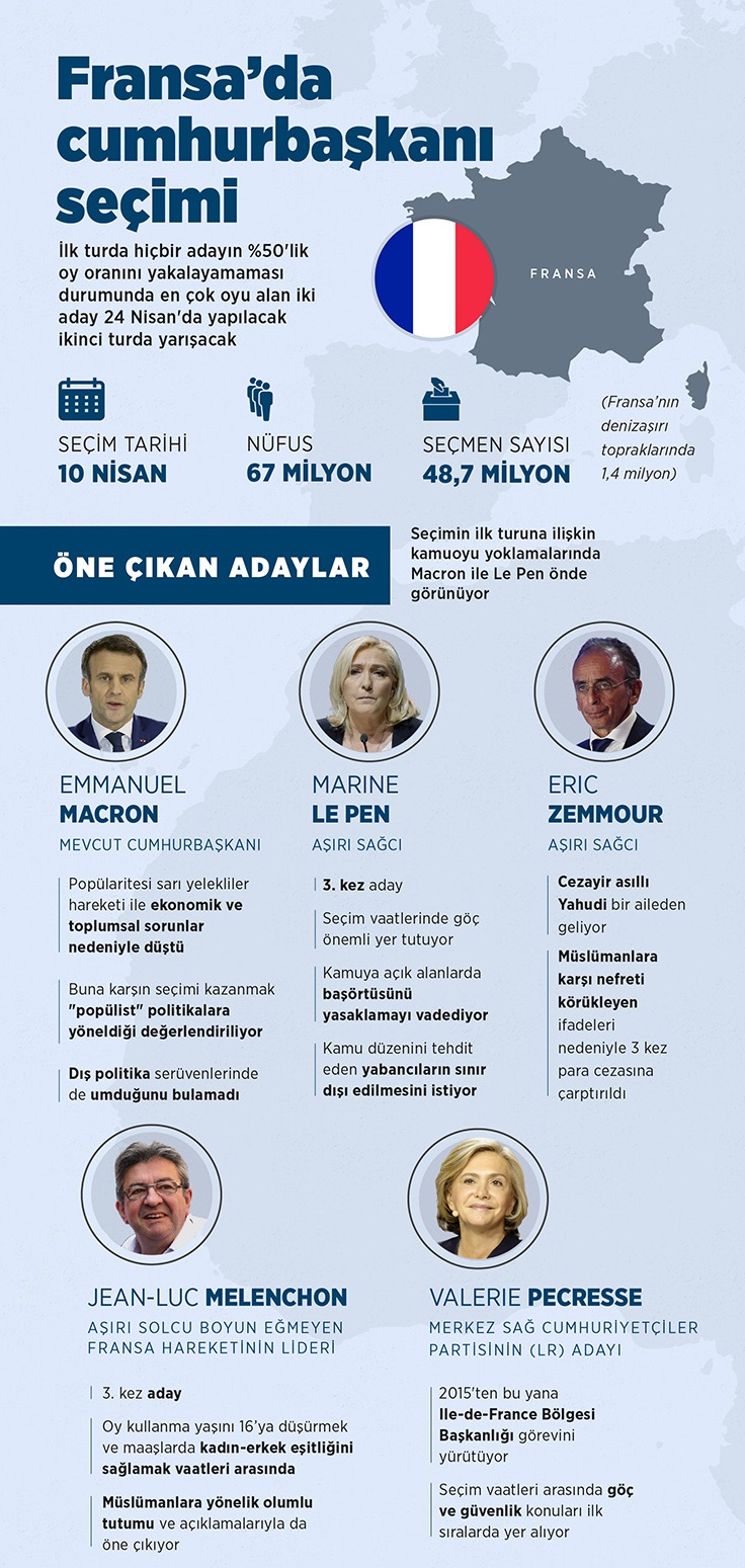Adaylar arasında Cumhurbaşkanı Macron, merkez sağ Cumhuriyetçiler Partisinin (LR) adayı Valerie Pecresse, aşırı sağcı Marine Le Pen, "ırkçı" görüşleriyle bilinen aşırı sağcı Eric Zemmour ve aşırı solcu Boyun Eğmeyen Fransa Hareketinin lideri Jean-Luc Melenchon'un isimleri öne çıkıyor.
