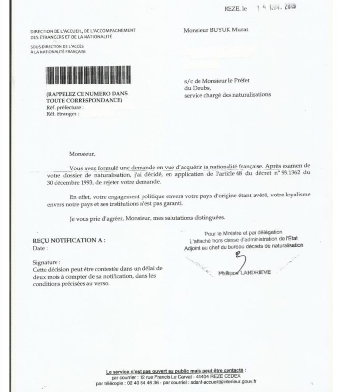 Konuyla ilgili Murat Büyük “Fransız makamları, Türk siyasetine bağlılığım olduğunu öne sürerek bu başvuruyu reddetti. Ben Türkiye’ye hiçbir partiye üye değilim, bu partilerinde hiçbir zaman propagandasını yapmadım.Ancak Türkiye Cumhurbaşkanı Recep Tayyip Erdoğan’a olan muhabbetimi her zaman dile getirdim. Gerek Sosyal medyadaki paylaşımlarım, gerekse arkadaşlarım arasında bunu ifade ederim” diyerek düşüncelerini aktardı