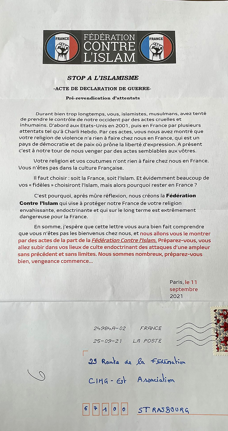 İslam Toplumu Milli Görüş (IGMG) teşkilatına bağlı Eyüp Sultan Camisi'ne önceki gün gönderilen "Savaş ilanı" başlıklı mektupta "Fransa'da İslam dinine yer olmadığı" ileri sürüldü.