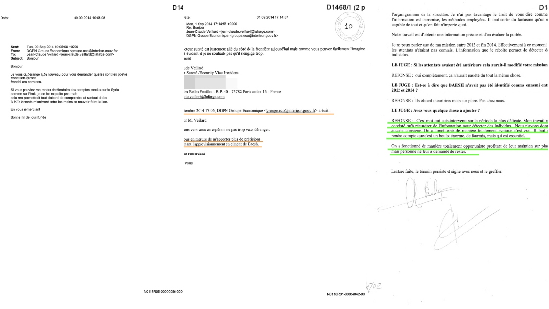 Şirket yetkilisi Veillard, mailinde Lafarge’ın Suriye’de halen aktif olduğunu ve çalışmalarının devam edebilmesi için “yerel aktörlerle” ilişki kurması gerektiğini belirtti. Güvenlik müdürü, istihbarat servisine, basında kendileri hakkında bazı olumsuz yayınlar yapıldığını belirterek, yöneticilerinin ve genel merkezin ne kadar risk altında olduğunu sordu.
