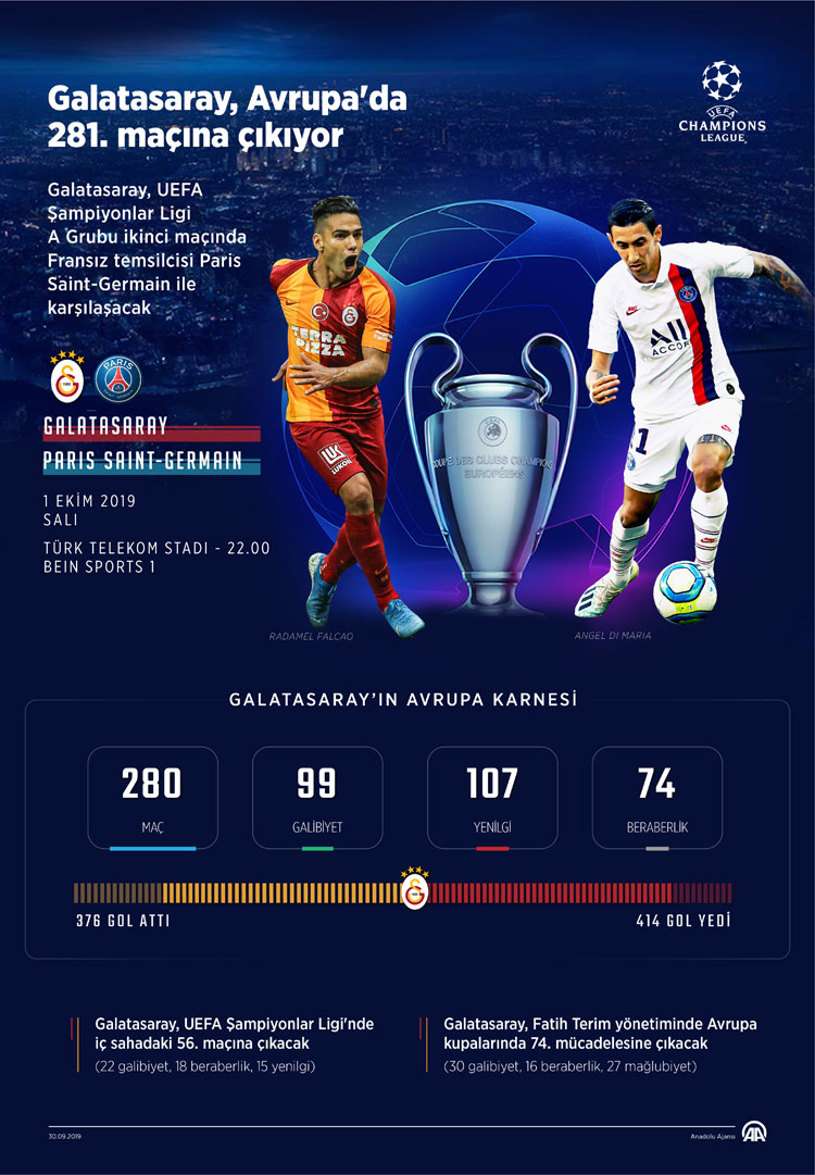 UEFA Şampiyonlar Ligi A Grubu ikinci maçında 1 Ekim Salı günü Fransa temsilcisi Paris Saint-Germain (PSG) takımını konuk edecek Galatasaray, Avrupa kupalarında 281. karşılaşmasına çıkacak.