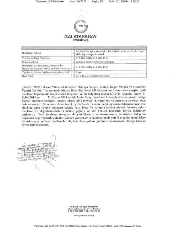 Sarı-kırmızılı kulüpten Kamuyu Aydınlatma Platformu'na gönderilen yazıda, vergi incelemesinde 20,8 milyon TL'lik vergi borcu olduğu belirtildi.