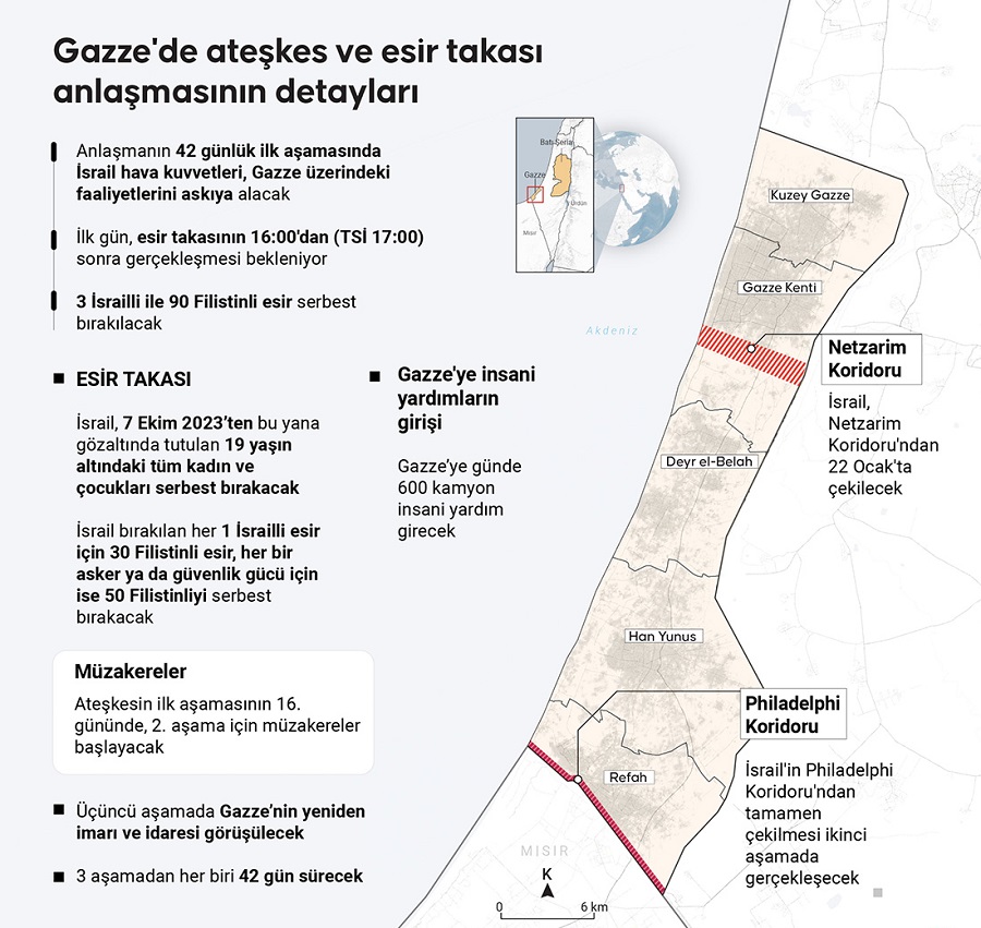 Açıklamada, Hamas'ın Gazze'den bugün serbest bırakılacak esirlerin listesini yayınlaması sonrası Gazze'de ateşkesin TSİ 12.15'te başladığı kaydedildi.