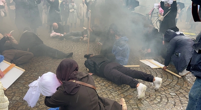 Siren ve uçak sesleriyle başlayan gösteride, bomba sesi efektiyle yere yatan grup, daha sonra dumanların arasında hayatını kaybeden çocuklarını aramaya başladı.