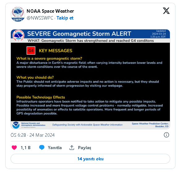 Ulusal Okyanus ve Atmosfer Dairesi (NOAA), Güneş'te yaşanan patlama hakkında bir bildiri yayınladı. Bildiride, jeomanyetik fırtınanın elektronik araçlarda problemlere yol açabileceği uyarısında bulunuldu. GPS'lerde sıkıntı çıkabileceği eklendi. Bu tür fırtınalar genellikle Dünya'ya Güneş'ten gelen yüklü parçacıkların atmosferle etkileşime girmesi sonucu oluşur ve manyetik fırtınaları tetikleyebilir.