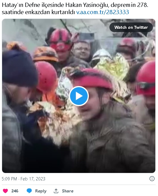 Ekiplerce enkazdan depremin 278. saatinde çıkarılan Yasinoğlu, hastaneye kaldırıldı.