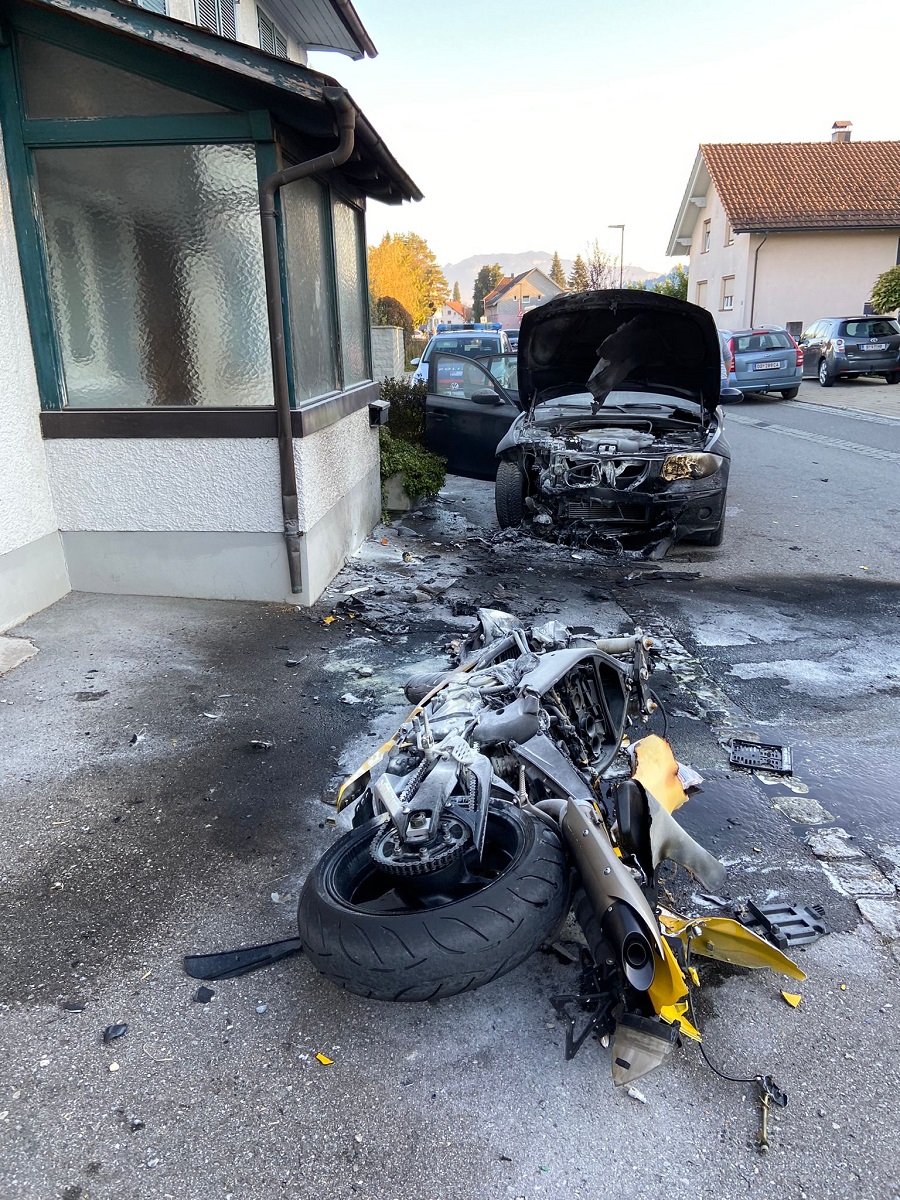 Yanan araçlar yoldan geçenler tarafından yangın söndürücüleri ile söndürülürken, her iki sürücüde yaralandı ve Bregenz ve Dornbirn hastanelerine kaldırıldı. Motosikletli sürücüde yapılan alkol testi pozitif çıktı. Her iki araçta hurdaya döndü.