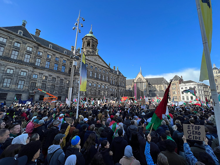 Göstericiler ellerinde "Çocukları öldürmek meşru müdafaa değildir", "Etnik temizlik meşru müdafaa değildir", "İsrail yine çocukları öldürüyor", "Apartheid'i durdurun, Soykırımı durdurun", "Filistinliler için adalet nerede", "Filistinlilerin hayatı önemlidir", "Hey Rutte! Filistinliler için de ses çıkar", "İsrail terörüne son ver" yazılı dövizler taşıdı.