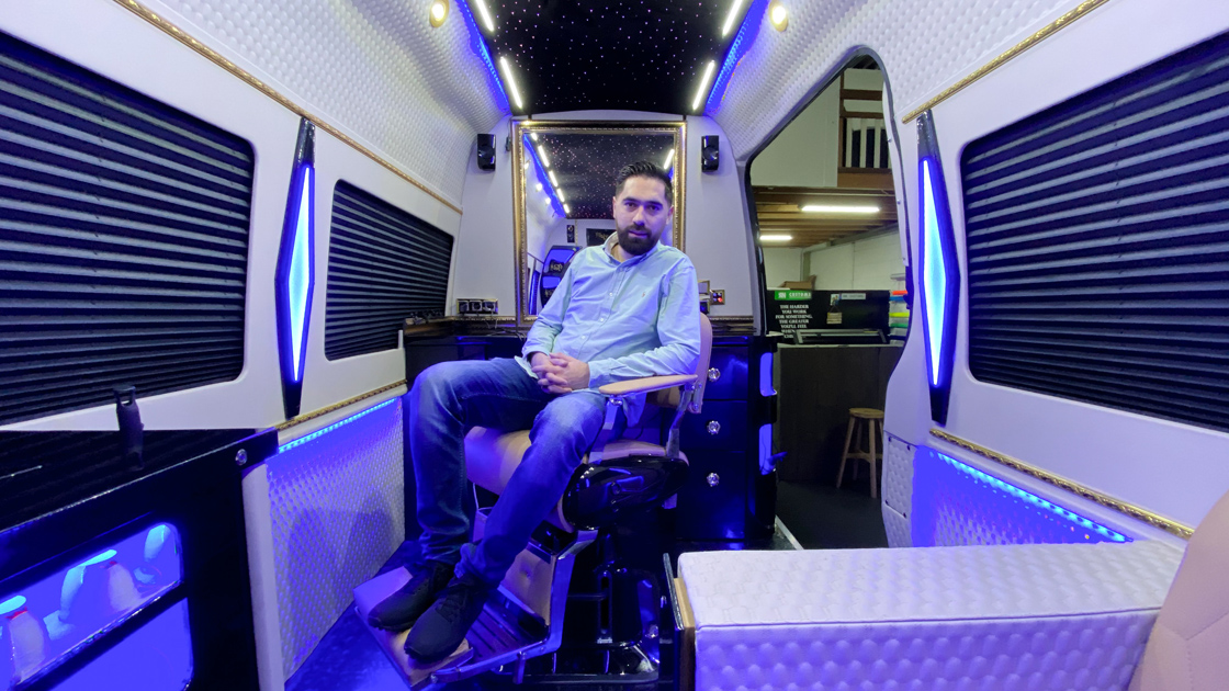 Hollanda'da Türk berber Serdar Tetik, içini kuaför salonuna çevirdiği bir minibüsle Avrupa'nın her yerine "seyyar berber" hizmeti veriyor.