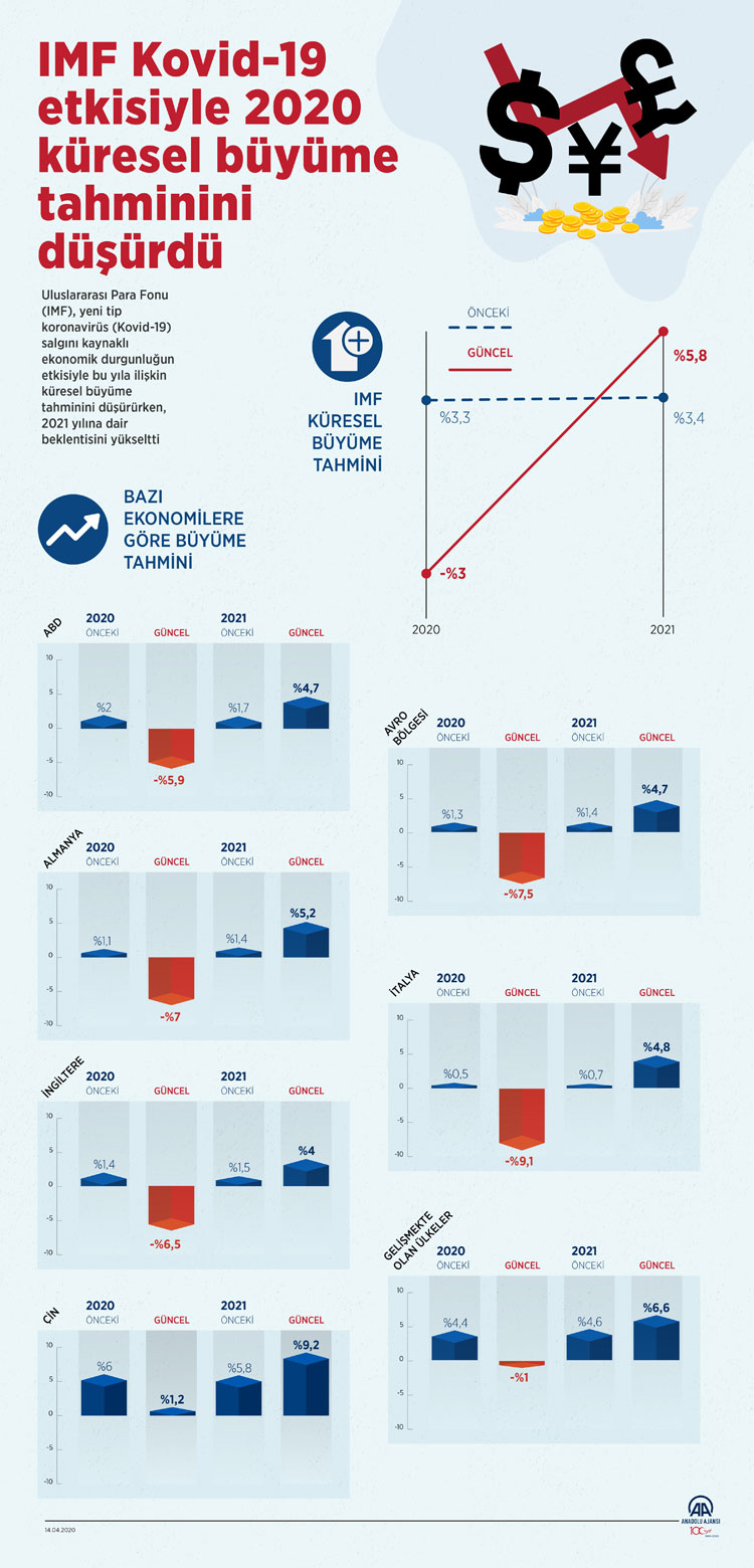 Gelişmekte olan ülke ekonomilerinin büyüme tahmini ise 2020'de yüzde 4,4'ten yüzde eksi 1'e çekilirken, 2021'de yüzde 4,6'dan yüzde 6,6'ya çıkarıldı.