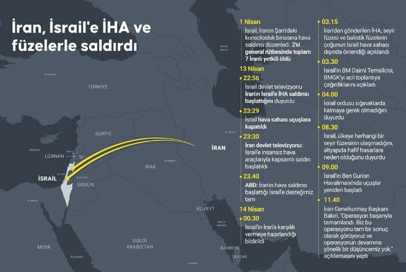 İran, İsrail'in 1 Nisan'da Şam'daki konsolosluğunu bombalamasına 13 Nisan'da karşılık verdi. 1 Nisan'daki saldırıda 2'si general olmak üzere 7 üst düzey Devrim Muhafızı hayatını kaybetmişti. İran'ın kendi topraklarından başlattığı misillemede onlarca insansız hava aracı (İHA) ve seyir füzesi kullanıldı. Fırlatılan mühimmat sayısal olarak etkileyici olsa da, neredeyse tamamı İsrail'in Demir Kubbesi ve müttefik hava savunma sistemleri tarafından engellendi ve hiçbir kayıp yaşanmadı.