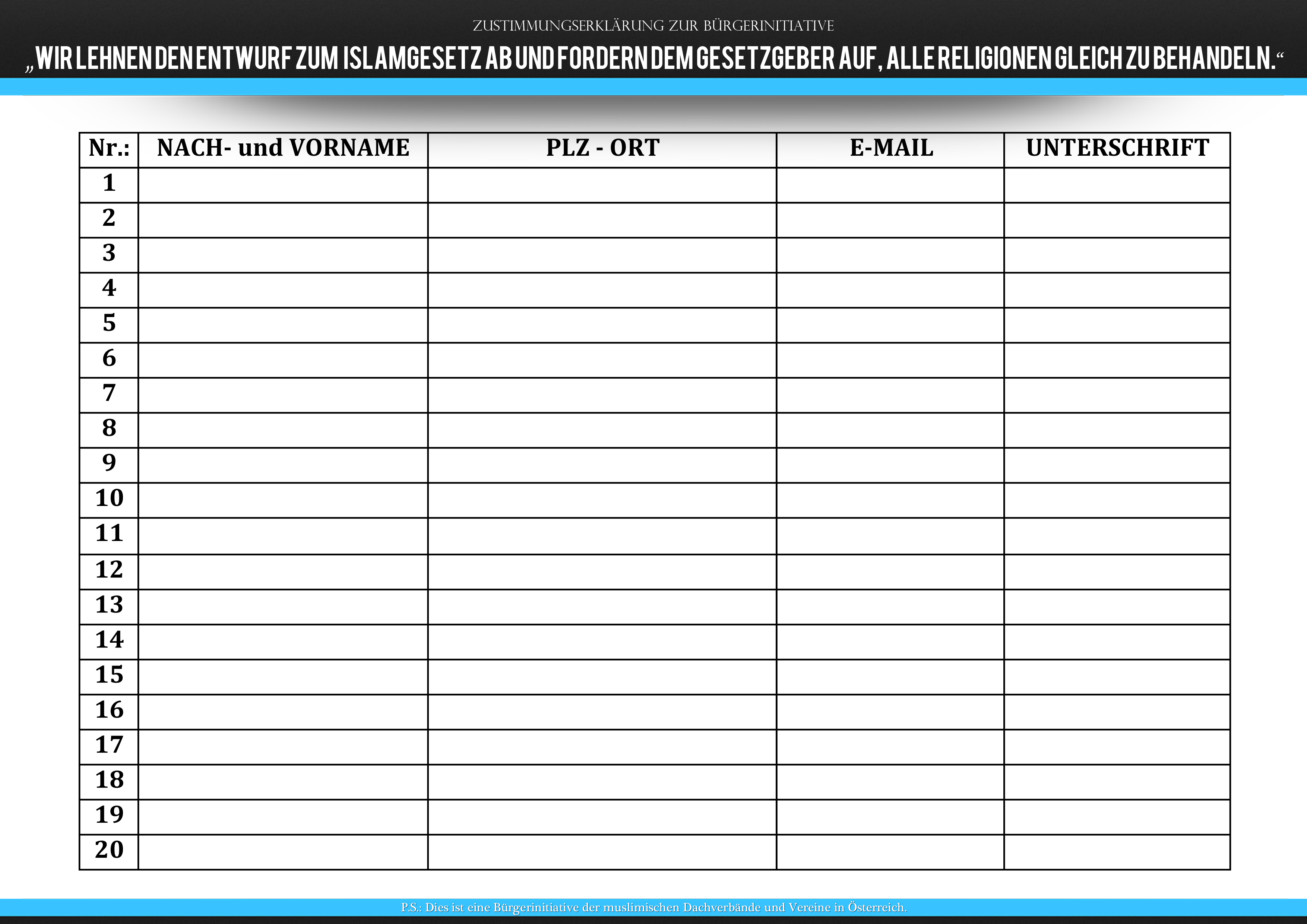 İGGİÖ (Avusturya İslam Cemaati) önderliğinde dört büyük İslami cemaat olan AİF (Avusturya İslam Federasyonu), ATİB (Avusturya Türk İslam Birliği), VİKZ (İslam Kültür Merkezleri Birliği) ve ATF (Avusturya Türk Federasyonu) ortak bir çalışma ile bir imza kampanyası düzenliyor.