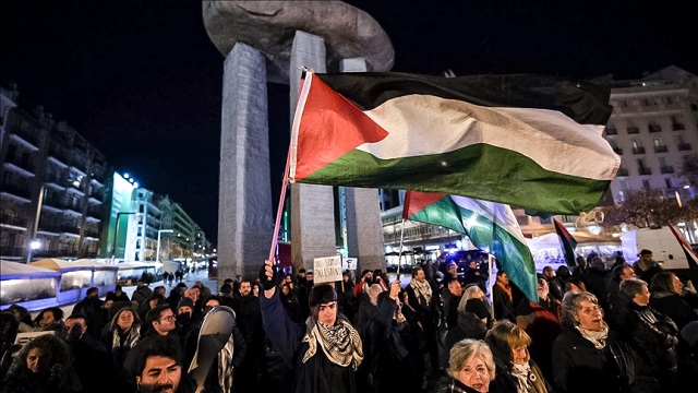 Filistin bayrakları sallayan kalabalık, "İsrail'e boykot", "Katil İsrail", "Özgür Filistin", "Yaşasın Filistin'in özgürlük mücadelesi" sloganları attı.