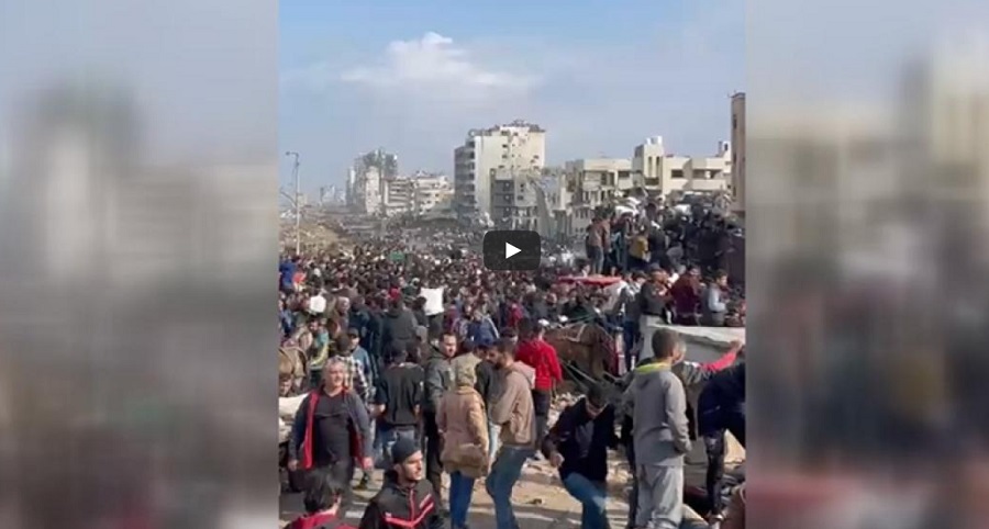 Binlerce Filistinli, uluslararası yardım kuruluşları tarafından ulaştırılan gıda yardımlarından alabilmek için Gazze kentinin Tel el-Heva Mahallesi'ndeki Er-Raşid Caddesi'nde toplandı.
