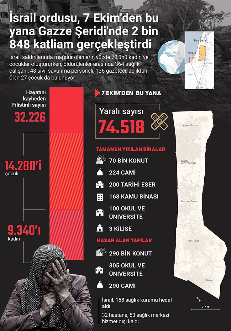 İsrail'in Gazze Şeridi'ne 170 gündür düzenlediği saldırılarda 14 bin 280'i çocuk ve 9 bin 340'ı kadın olmak üzere 32 bin 226 kişi hayatını kaybetti, yaralananların sayısı ise 74 bin 518'e ulaştı.