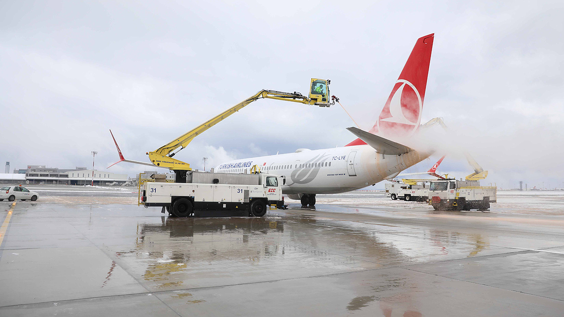 Yolcuların uçuş emniyetini ve konforlu seyahatini öncelikli hedef edinen THY, zorlu hava koşullarında performansını korumak için uçaklara iniş-kalkış öncesi ve sonrasında çeşitli işlemler yapıyor.