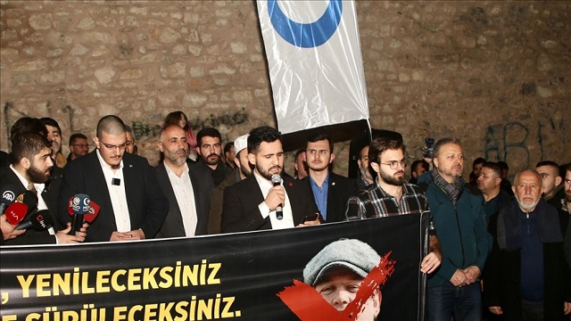 Kur'an-ı Kerim okunmasıyla başlayan protesto gösterisinde basın açıklamasını AGD İstanbul İl Başkanı Mehmet Yaroğlu yaptı.