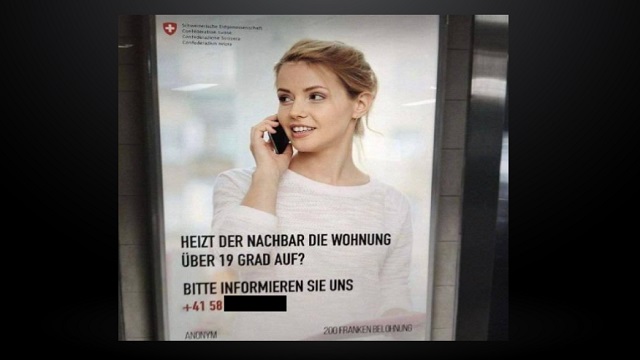 Afişte İsviçre Federal Hükümetinin resmi bilgileri yer alırken, komşusunu şikayette bulunanların 200 Frank para ödülü kazanacağı belirtilmişti.