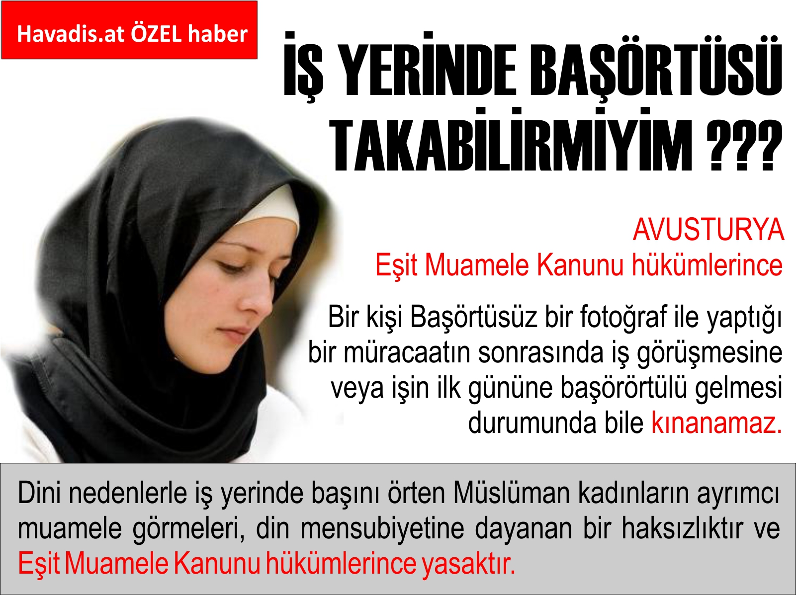 Müslüman bir kadın bir işte çalışıyorsa ve başörtüsünü artık iş yerinde de takmak istiyorsa, kanun tarafından böyle bir durumda da korunmaktadır.