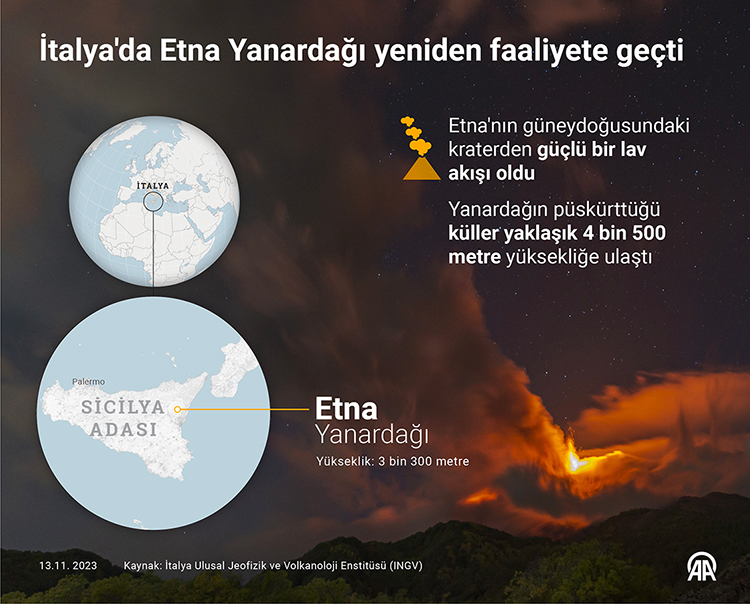 İtalya Ulusal Jeofizik ve Volkanoloji Enstitüsü (INGV) Katanya şubesinin açıklamasında, Etna'nın güneydoğusundaki kraterden güçlü bir lav akışı olduğu ve yanardağın püskürttüğü küllerin yaklaşık 4 bin 500 metre yüksekliğe ulaştığı belirtildi.