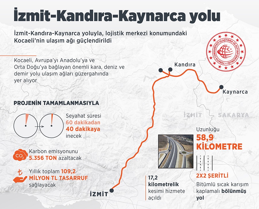 "İzmit-Kandıra-Kaynarca yolu 58,9 kilometre uzunluğunda, '2x2 şeritli', bitümlü sıcak karışım kaplamalı bölünmüş yol olarak projelendirildi. Proje kapsamında ilk olarak TEM Otogar K-1 Köprülü Kavşağı’nı içeren 4,2 kilometrelik kesimi, 3 kilometrelik Çubuklubala-Çubuklu Osmaniye varyantı ile 4 kilometrelik Cezaevi varyantını vatandaşlarımızın hizmetine sunduk.