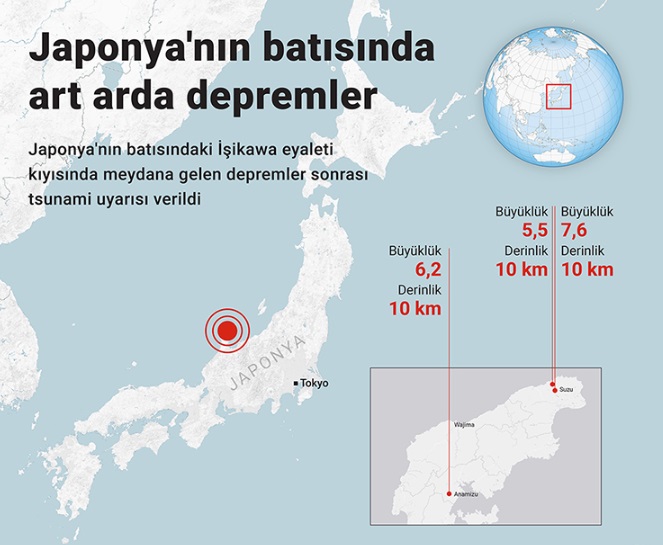 Japonya Meteoroloji Ajansının açıklamasına (JMA) göre, İşikawa'nın Noto Yarımadası ve açıklarında art arda depremler oldu.