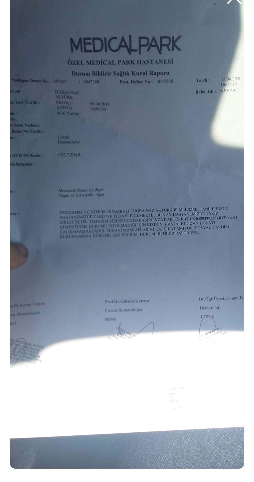Tuğba Naz Aktürk 16 Aylık, Anne ve Babasıyla Konya Ereğlide ikamet ediyor. Doğduğundan beri lösemi hastası ve Nf1 hastalığı var. 1,5 senedir Konya Meram Tip fakültesi ve Ankara Hacettepe Hastanesi takiplidir.