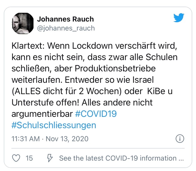 Avusturya hükümetinin Cumartesi günü açıklaması beklenilen daha katı tecrit kararı ile ilgili açıklamada bulunan Yeşiller Vorarlberg genel başkanı Johannes Rauch, 'Okullar kapanacaksa, fabrikalarda kapanmalı' dedi. Rauch; 'Okulların dahi kapanacağı bir ortamda iş yerlerinin açık kalması mantıksız.Ya iki hafta hem okul hemde fabrikaları kapatırsınız, yada küçük çocuk bakım merkezleri ile birlikte ilk ve orta okullarıda açık bırakırsınız' diyen Rauch, İsrail örneğini verdi.