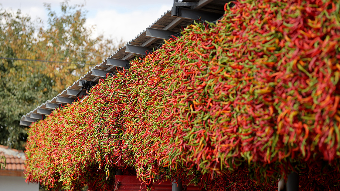 Dizilen biberler, yetiştiricilerin evlerinin bahçesinde hazırladıkları üstü kapalı alanlarda kurutuluyor.