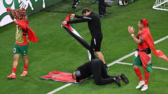 Katar'daki turnuvada İspanya'yı penaltılarla eleyerek çeyrek finale yükselen Fas Milli Takımı oyuncuları da yaptıkları kutlamada Filistin bayrağı açarak poz verdi.