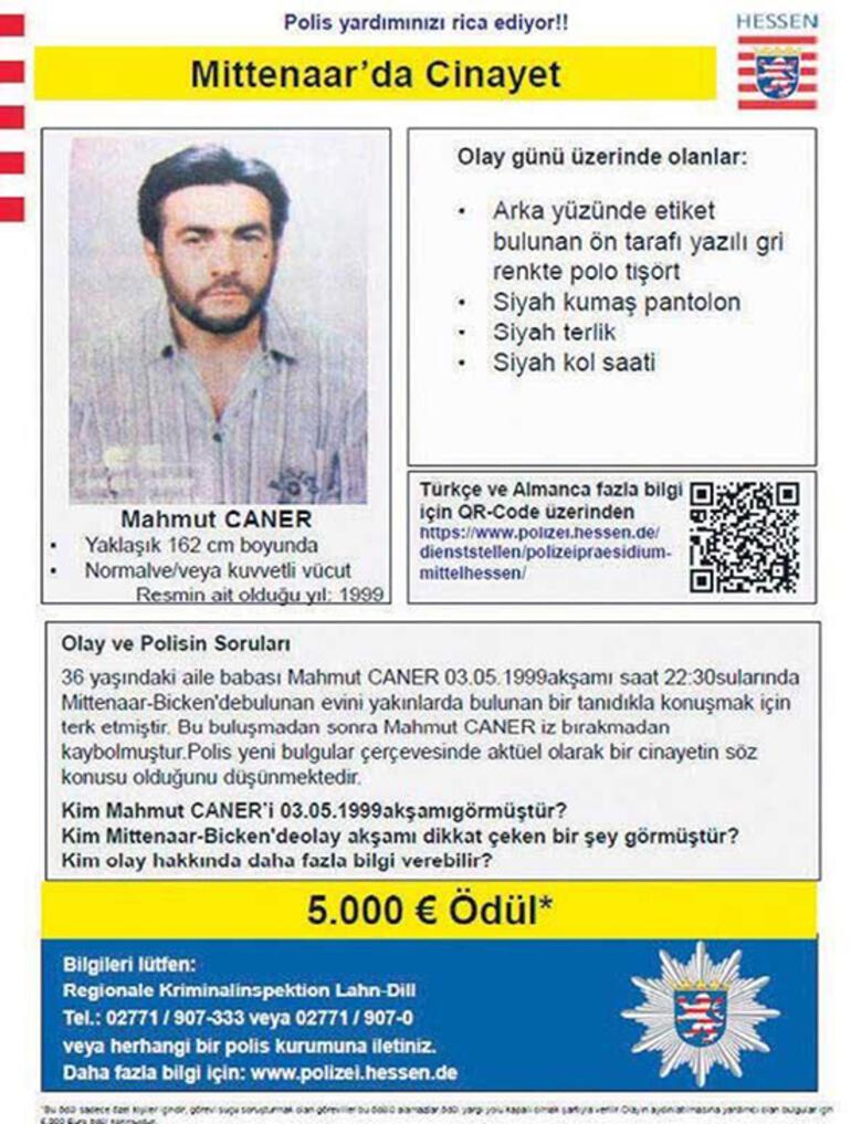 Caner’i arayan Alman polisi, uzun yıllar hiçbir ize rastlamadı. 2017 yılında ise Caner’in evine yaklaşık 10 kilometre uzaklıktaki ormanda gömülü kemikler bulundu. DNA incelemesinde kemiklerin Caner’e ait olduğu ve cinayete kurban gittiği tespit edildi. Cinayeti çözmek için Alman polisi 5 bin euro para ödülü bile koydu. Caner’in başta ailesi olmak üzere arkadaşlarının da ifadesini alan polis, ailesinin tanıdığı bir kişi tarafından öldürüldüğünü belirledi. Mahmut Caner’in ölmeden önce kendisini tehdit eden katilin sesini teybe aldığı ortaya çıktı. İsmi açıklanmayan katilin, Almanya’dan Türkiye’ye kaçtığı tahmin ediliyor.
