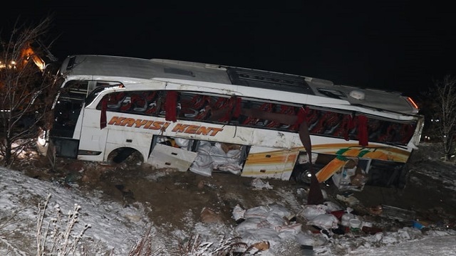Kayseri'nin Pınarbaşı ilçesinde Malatya-İstanbul seferini yapan Kayısı Kent Turizm'e ait, sürücüsünün kimliği henüz öğrenilemeyen 44 NK 222 plakalı yolcu otobüsü, Kayseri-Malatya kara yolunun 60. kilometresindeki Esenköy mevkisinde şarampole devrildi.