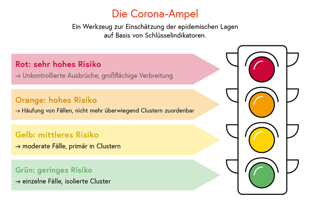 Trafik ışığı renkleri, epidemiyolojik durumun değerlendirmesine bağlı olarak farklılık gösterir ve nüfusa bir bölgenin ilgili riskini gösterir (tüm Avusturya, bireysel federal eyaletler, münferit bölgeler veya bölgeler):