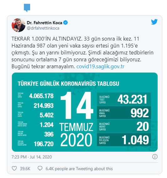 "Tekrar 1000'in altındayız. 33 gün sonra ilk kez. 11 Haziran'da 987 olan yeni vaka sayısı ertesi gün 1195'e çıkmıştı. Şu an yarını bilmiyoruz. Şimdi alacağımız tedbirlerin sonucunu ortalama 7 gün sonra göreceğimizi biliyoruz. Bugünü tekrar aramayalım."