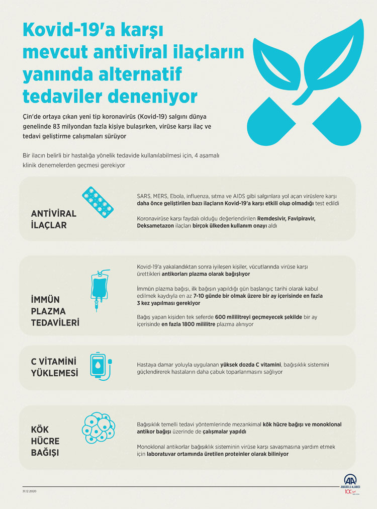 Çin'de ortaya çıkan yeni tip koronavirüs (Kovid-19) salgını dünya genelinde 82 milyondan fazla kişiye bulaşırken, virüse karşı ilaç ve tedavi geliştirme çalışmaları sürüyor.