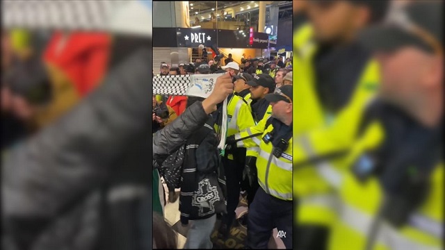 Oturma eylemi sürerken, Filistin yanlısı göstericilerin etrafını çevreleyen İngiliz polisi, ellerinde tren istasyonunda eylem yapmanın yasa dışı olduğunu belirten bildiriler dağıtarak göstericilerin istasyondan ayrılmasını talep etti.