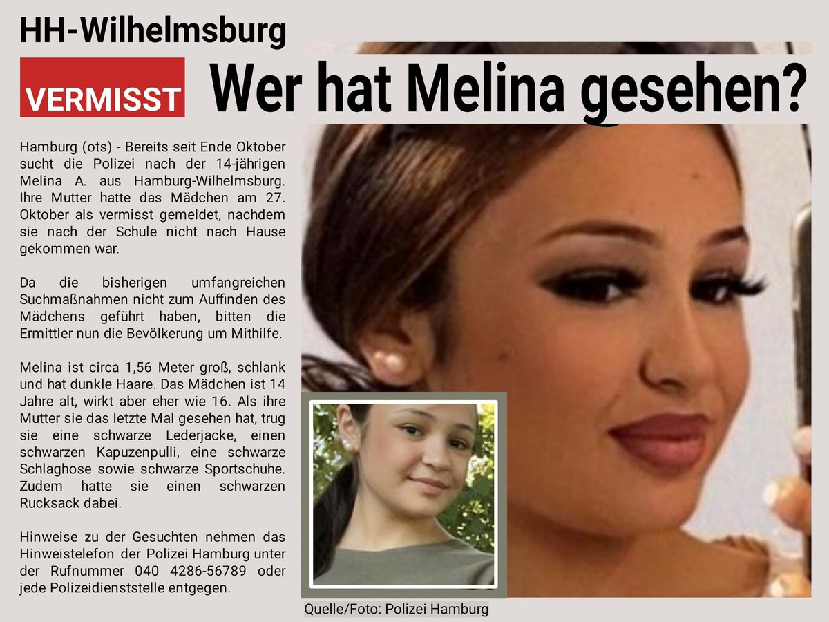 Hamburg kentinde yaşayan 14 yaşındaki Melina Aygün, 27 Ekim günü okula gitmek için çıktığı evine bir daha dönmedi. Aile sonuca ulaşamayınca polise haber verdi. Fotoğrafı yayınlanan Melina'nın 1,56 metre boyunda olduğu, yaşından büyük göründüğü, son olarak siyah deri ceket, siyah pantolon, siyah ayakkabı giydiği aktarıldı. Polis bilgi sahibi olanlardan 04286-56789 numaralı telefonu aramalarını istedi.