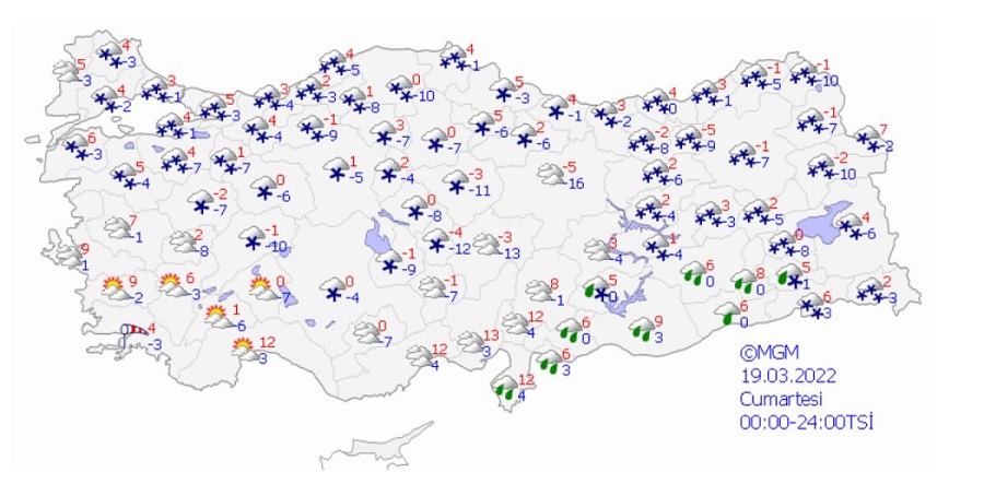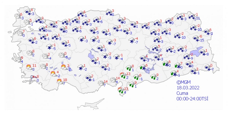 Genellikle karla karışık yağmur ve kar, Doğu Akdeniz kıyıları ve Güneydoğu Anadolu'nun güneybatısında yağmur ve sağanak şeklinde görülmesi beklenen yağışların gece saatlerinde Trabzon'un doğusu ile Rize ve Hopa çevrelerinde, yarın Marmara’nın doğusu, Batı Karadeniz, Orta Karadeniz kıyıları, Doğu Karadeniz, Doğu Anadolu’nun kuzeyi, İstanbul, Elazığ, Bingöl, Bitlis, Muş çevreleri ile Diyarbakır ve Batman’ın kuzey ve doğu kesimlerinde yerel olarak kuvvetli ve yoğun kar şeklinde olacağı bekleniyor.