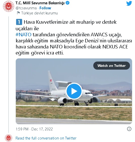 "Hava Kuvvetlerimize ait muharip ve destek uçakları ile NATO tarafından görevlendirilen AWACS uçağı, karşılıklı eğitim maksadıyla Ege Denizi'nin uluslararası hava sahasında NATO koordineli olarak NEXUS ACE eğitim görevi icra etti.