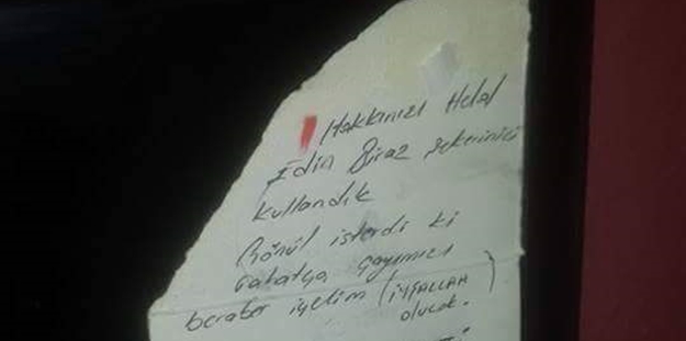 Bırakılna notta; ''Hakkınızı helal edin biraz şekerinizi kullandık, gönül isterdiki rahatça çayımızı beraber içelim, inşallah olacak. Türkiye Cumhuriyeti'' yazdı.