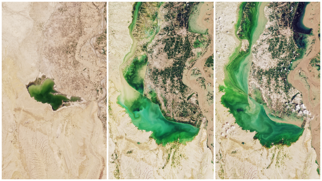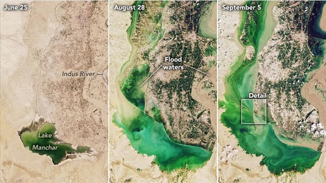 ABD Havacılık ve Uzay Ajansı (NASA), Manchar Gölü'nün 25 Temmuz, 28 Ağustos ve 5 Eylül’deki fotoğraflarını paylaştı.