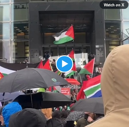 "Bu bir savaş değil, soykırımdır" sloganı atan göstericiler ellerinde Filistin ve Güney Afrika bayrakları taşıdı.