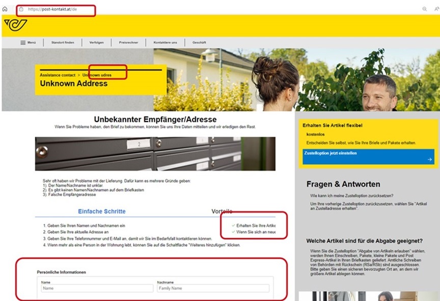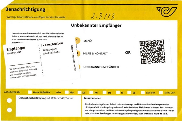 Bu bildirimlerde, failler "yatırılan" belgenin "süresi dolmuş bir kayıt formu" olduğunu belirtmekte. Bu bildirimlerde bir QR kodu görüntülenmekte. QR kodu tarandığında, potansiyel kurbanlar sahte bir web sitesine yönlendirilmekte. Bu web sitesinin Avusturya'nın Merkezi İkamet Kayıtları (ZMR) olması gerekiyor ve mağdurlardan bir sonraki adımda kişisel verilerini girmeleri isteniyor.
