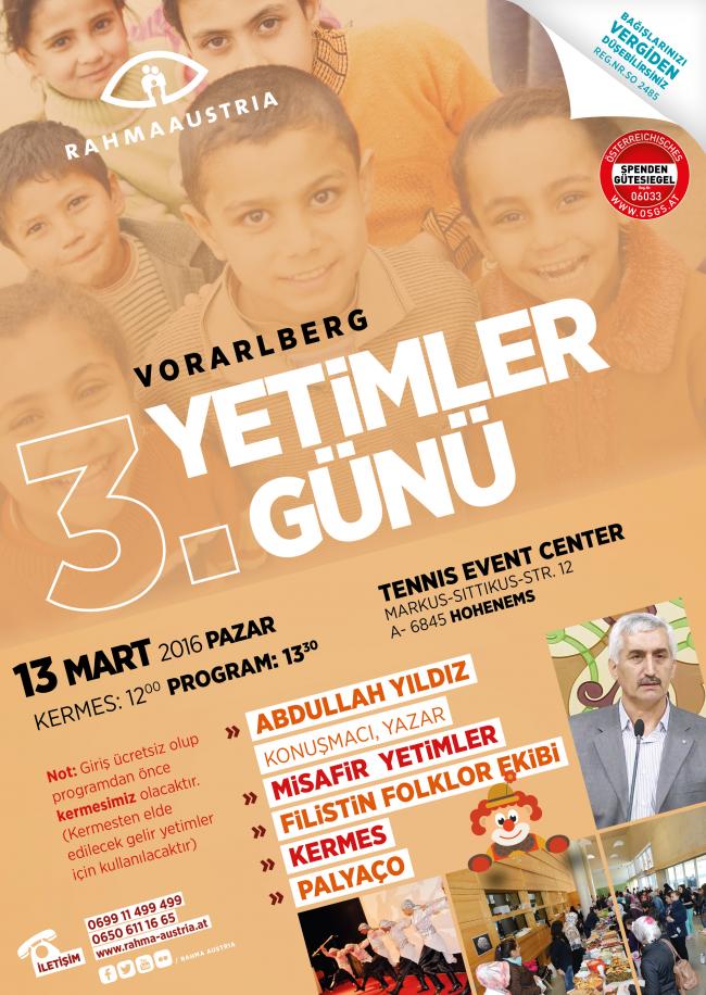 Rahma Austria İnsani Yardım Derneği, Hohenems Tennis Event Center'da 13 Mart pazar günü yetimler günü düzenliyor.